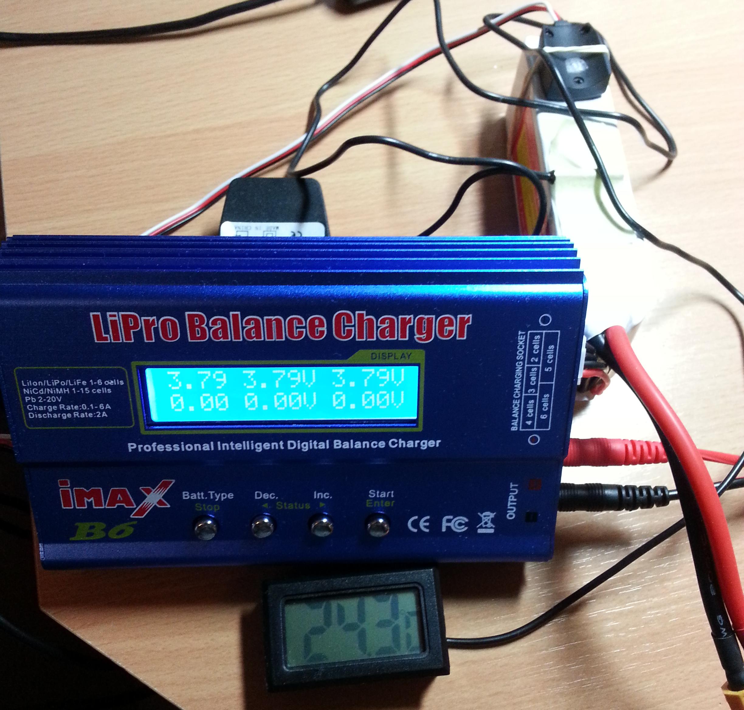 The pictures here, I made them only to show my experiments, it is not safe to charge Lipos like this over a wooden table! And check the temperature of the battery everytime that it is not hot, in this schematic no heat must be noticed. I have a small thermometer attached to the battery so I can visually check the temperature.